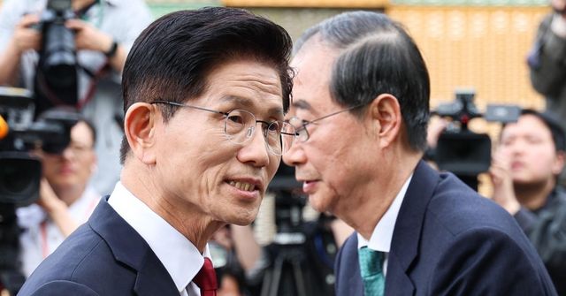 김문수 국민의힘 대통령 후보와 한덕수 무소속 대선 예비후보가 8일 서울 여의도 국회 내 카페에서 단일화 관련 회동을 마치고 인사하고 있다. / 뉴스1