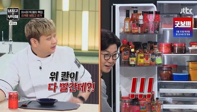당근과 버섯을 직접 키운다는 김재중은 “당근잎이 영양소가 높다고 들었다. 파슬리처럼 쓴다”고 설명했다. 이어 공개된 김재중 냉장고엔 빨간 소스가 가득했다. 김재중은 “매운 거 잘 먹는다. 우리나라에서 매운 거 안 먹어본 거 없는 것 같다”라고 밝혔다. 가장 위험한 매운 소스가 60만 스코빌 지수 정도 된다고. 장근석은 “시식 가능한가요?”라고 나섰고, 김재중과 둘 중에 누가 매운 걸 더 잘 먹느냐는 질문에 “매운맛을 좋아하는 분이고, 전 매운맛을 못 느낀다”라고 밝혔다.