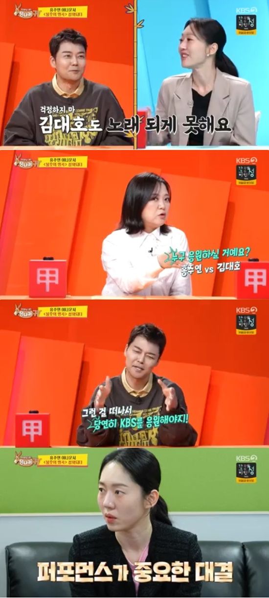 전현무는 김숙이 와이프 홍주연, 절친 김대호 중 누구를 응원할 건지 물어보자 "절친보다 와이프죠"라며 "그런 걸 떠나서 KBS 응원해야지"라고 말했다.