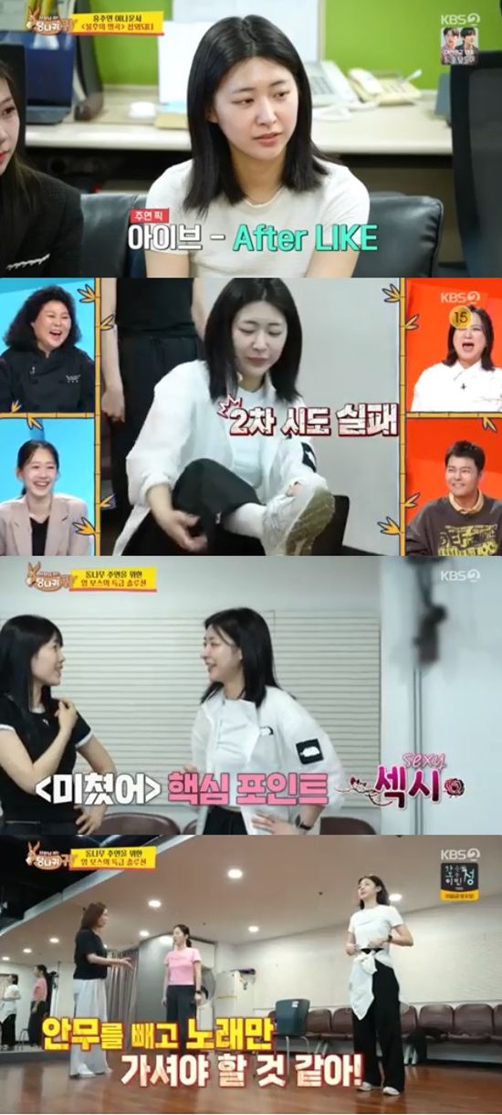 홍주연은 손담비의 의자춤에 도전했다가 너무 뻣뻣한 나머지 엄지인에게 의자춤을 넘겨주게 됐다.