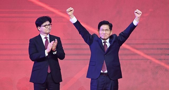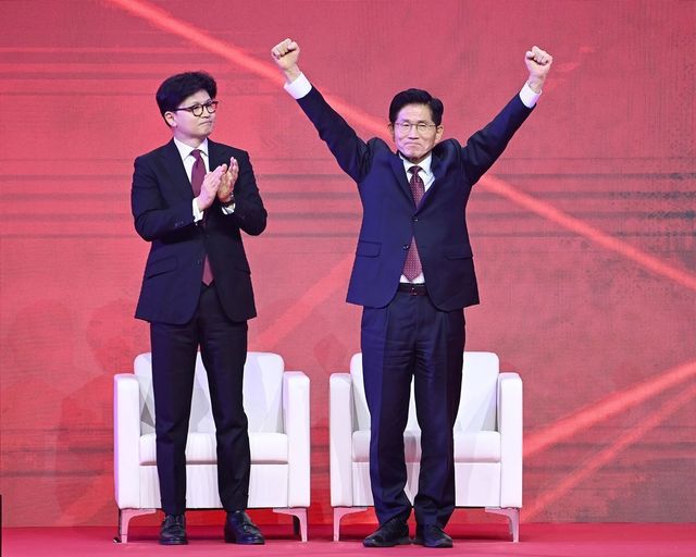 김문수 국민의힘 대통령 후보가 지난 3일 경기 고양시 킨텍스에서 열린 5차 전당대회에서 최종 후보로 확정된 뒤 두손을 번쩍 들고 있다. 왼쪽은 손뼉치는 한동훈 대선 경선 후보. / 뉴스1