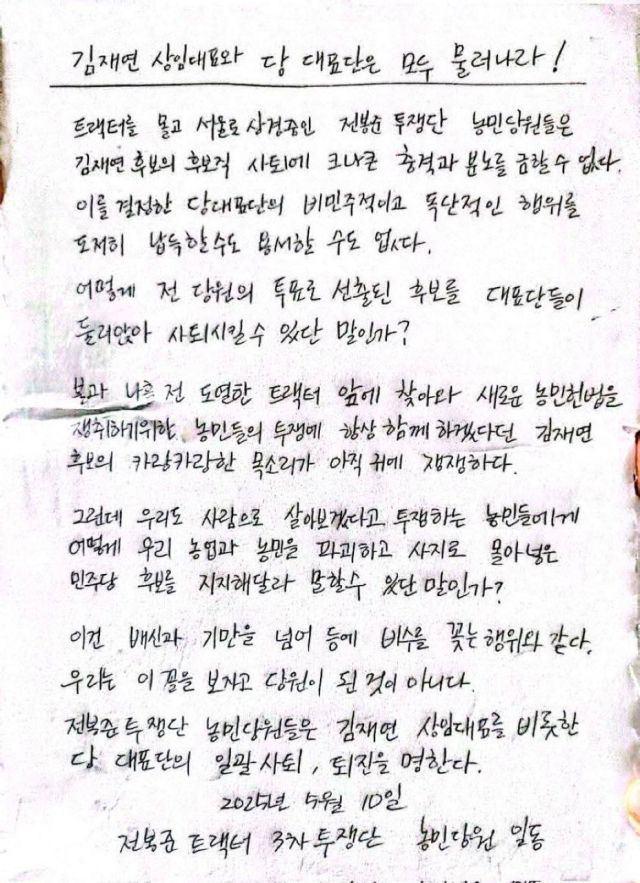 전봉준트랙터 3차 투쟁단은 지난 10일 '전봉준 트랙터 3차 투쟁단 농민당원'의 명의로 "김재연 진보당 상임대표를 비롯한 당 대표단의 일괄 사퇴, 퇴진을 명한다"는 손으로 쓴 성명을 SNS에 게재했다.