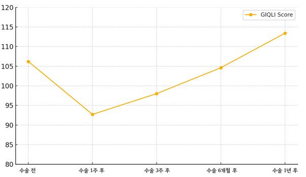 연구 결과 환자들은 수술에 따른 일시적인 불편함으로 삶의 질 지수가 낮아졌지만, 대부분 짧은 시간 내에 회복하면서 삶의 질 지수가 향상된 사실을 확인했다. 실제로 수술 전 GIQLI 점수는 수술 전 평균 106.2점에서 수술 1주 후 92.7점으로 낮아졌지만, 6개월 후에는 104.6점, 1년 후에는 113.4점으로 오히려 수술 전보다 높아진 결과를 보였다.