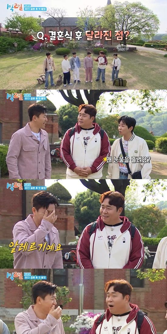 그러자 마찬가지로 신혼인 조세호는 "그게 바로 가장의 책임감"이라고 김종민을 두둔했다. 결혼 후 달라진 점을 묻자 김종민은 눈 앞머리를 닦는 제스처를 취했고, 딘딘이 "왜 눈물을 흘리냐"고 묻자 김종민은 "알레르기"라고 답했다.