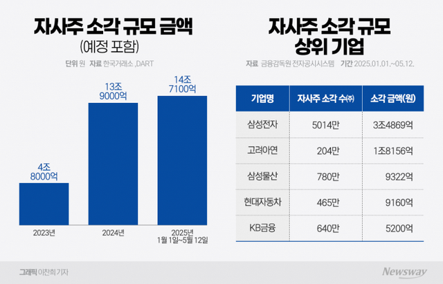 12일 금융감독원 전자공시시스템에 따르면 올해 1월부터 이날까지 자사주 소각을 공시한 기업은 유가증권 상장사 63곳, 코스닥 상장사 41곳 등 총 104개사로 집계됐다. 이 기간 공시된 자사주 소각 금액은 9조5000억원, 소각이 예정된 금액까지 포함하면 총 14조7100억원에 이른다. 이는 지난 한해 연간 소각 규모인 13조9000억원을 반년도 채 지나지 않아 넘어선 수준이다.