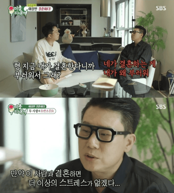 이상민의 결혼에 대해 전혀 몰랐냐는 질문에 서장훈은 “누가 있다는 느낌을 전혀 받지 못해서 사실 당일에도 전혀 믿어지지 않았다. 몰카라고 생각해서 짜증이 났었다”라며 솔직한 심경을 전했다. 김준호 역시 “내가 결혼한다니 부럽고 똥줄 타서 그러는 거냐”라며 당황한 기색을 감추지 못했다. 직접 사진을 본 서장훈과 김준호는 “젊으시다. 이렇게 아름다운 분이 왜… SNS에 예쁜 여자 사진 캡쳐한 건 아니냐”라며 의심을 거두지 않았다.