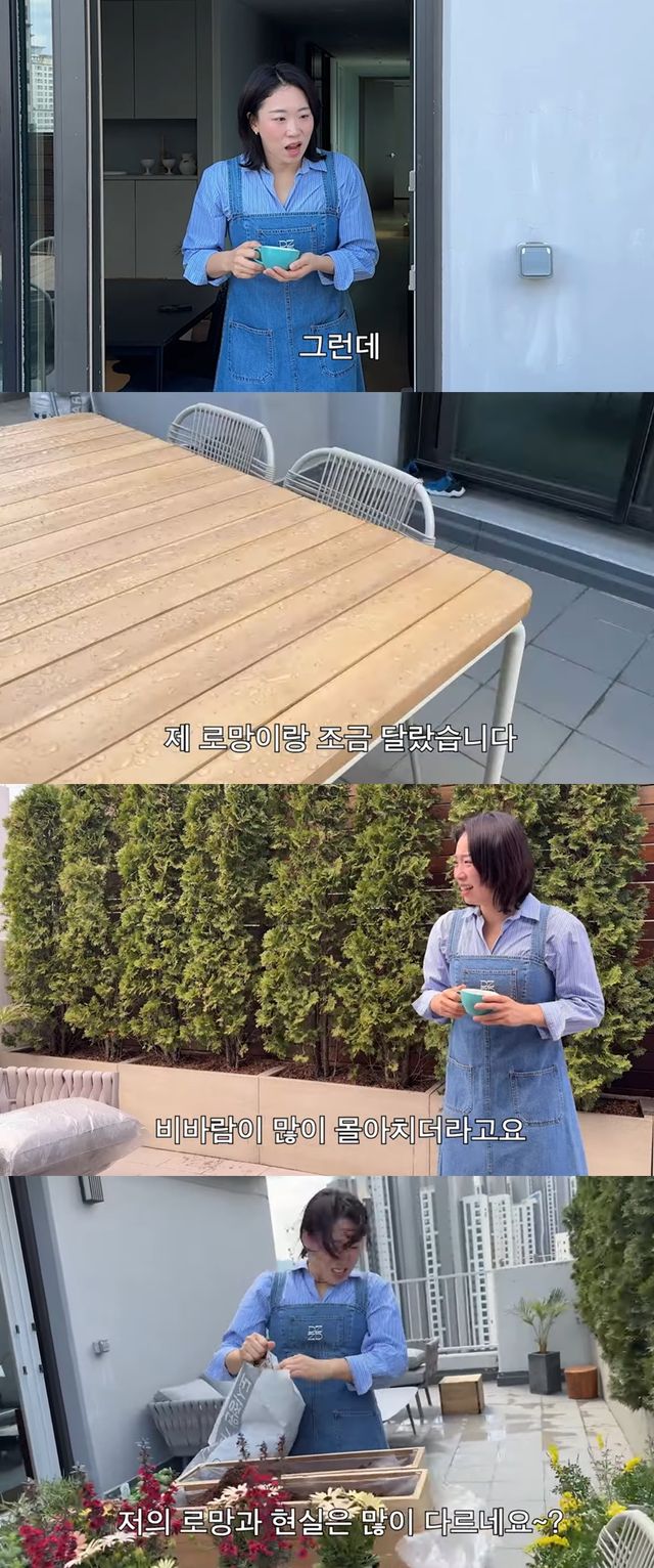 이날 그는 그는 새 집의 테라스로 향하며 "테라스 있는 집으로 이사 온 거 아시지 않냐. 근데 제 로망이랑 조금 달랐다. 비바람이 많이 몰아치더라"고 밝혔다.