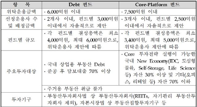 이 코어플랫폼 펀드의 주요 투자대상은 ‘코어투자전략 실행이 가능한 국내 부동산’이다. 오피스, 리테일 등이 자산의 70% 이하를 차지해야 하며 나머지 30% 이상은 데이터센터(IDC), 도심형 물류, 셀프 스토리지, 라이프 사이언스 등으로 구성해야 한다.