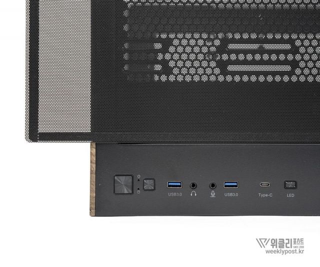 외부 연결성도 뛰어나다. 케이스 상단에는 USB-A형 단자와 USB-C형 단자, 스테레오 입출력 단자 등 다양한 외부 연결 인터페이스를 제공한다. 기본적으로 USB-3.2 Gen1(A형) 단자 2개와 USB 3.2 Gen2x2(C형) 1개가 제공된다. USB-C형 단자는 최대 20Gbps 전송이 가능한 규격이어서 외장 SSD나 고속 전송장치 사용에 유리하다. 기본적인 전원, 리셋 버튼 외에도 LED 점등 상태를 바꾸는 버튼도 제공해 취향에 따른 PC 분위기 연출이 가능하다.