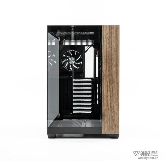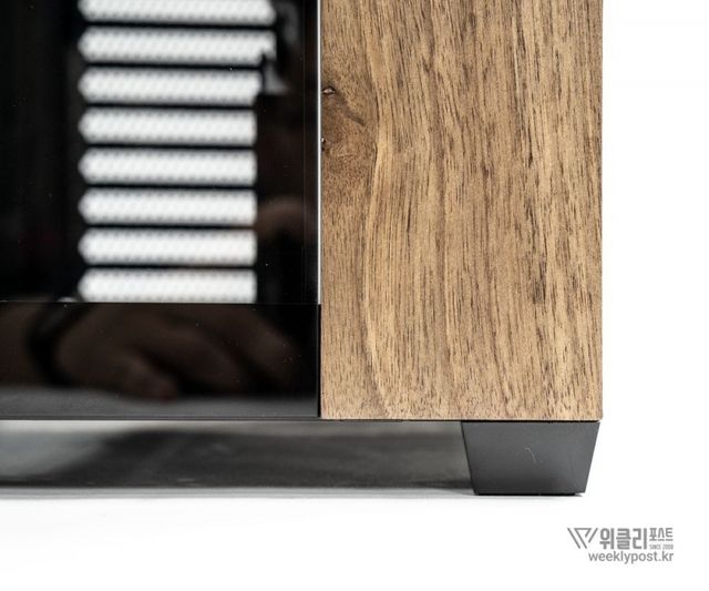 위즈맥스 우드리안 맥스의 디자인은 인상적이다. 큰 틀에서 보면 어항형 케이스로 전면과 측면이 시원하게 보이는 형태다. 하지만 전면부 약 1/4 영역에 우드 패널을 적용함으로써 묵직한 인상을 더했다. 최신 유행하는 PC 케이스의 역할과 실내 인테리어 소품의 역할 모두 가능하게끔 설계한 것으로 보인다. 전략적인 접근을 통해 더 많은 소비자의 선택을 받을 수 있게 유도한 것이다.