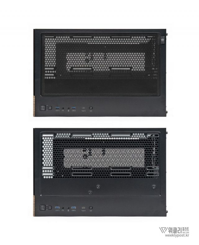 흔히 어항형 케이스는 보기에 좋아도 공기 흐름 구성은 어려운 경우가 많다. 열 배출이 제한적이기 때문이다. 마이크로닉스는 이 부분을 고려해 위즈맥스 우드리안 맥스 측면부에 통풍구를 내었다. 케이스 측면 패널에는 듀얼 에어홀 설계를 적용해 파워서플라이의 발열과 주 공간의 열배출이 가능하게 설계했다. 후면부 곳곳에도 열 배출을 위한 타공 처리가 되어 있어 안정적인 공기 흐름을 구성할 수 있다.