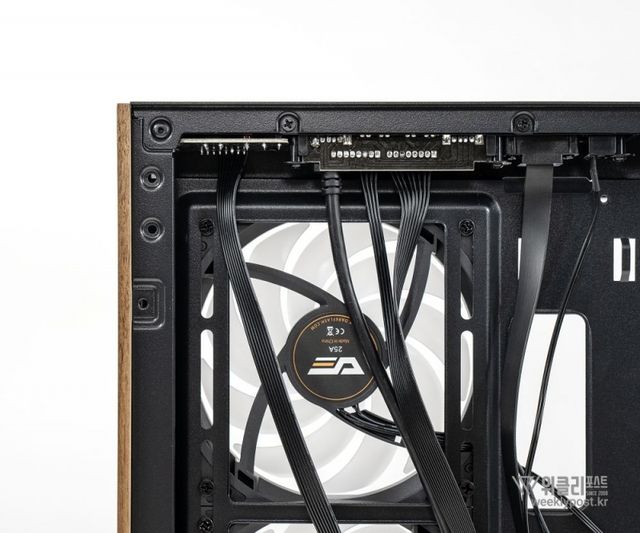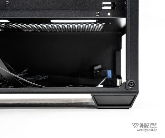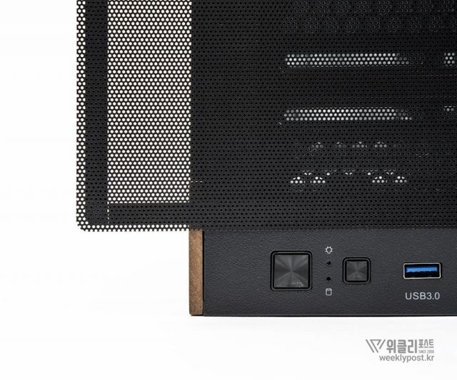 그래서 타협할 수 있는 것이 어떤 기능이 부여되지 않는, 그러나 완성 후엔 목재 특유의 질감과 고급스러움을 드러낼 수 있는 프론트 패널 우측의 공간이 아니었을까 생각된다. 해당 위치는 섀시로서의 기능이 요구되지도 않으며, PC에서 발생하는 열의 영향을 가장 적게 받는 위치이기도 하기 때문.