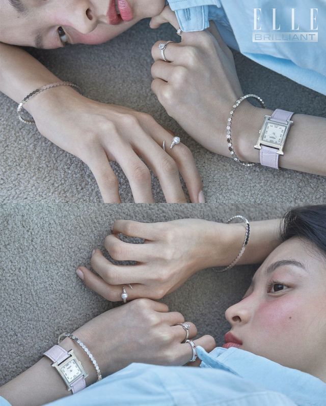 오른팔에 착용한 화이트 골드 소재의 ‘비 드 쇼메’ 브레이슬릿은 8백만원대, 왼팔에 착용한 화이트 골드 소재에 브릴리언트 컷 다이아몬드를 세팅한 ‘비 드 쇼메’ 브레이슬릿은 1천만원대 모두 CHAUMET. 오른손 검지에 착용한 화이트 골드에 아코야 진주와 다이아몬드를 세팅한 ‘데인저 호른 플러스 다이아몬드 파베’ 링은 가격 미정 TASAKI. 왼팔에 착용한 베이비 핑크 컬러의 ‘에이치 아워’ 워치는 가격 미정 HERMĒS. 왼손 검지에 착용한 화이트&옐로 골드에 루비를 세팅한 ‘마크리 포지타노 이터넬레’ 링은 6백만원대 BUCCELLATI. 중지에 착용한 에메랄드 컷 다이아몬드가 돋보이는 ‘미누 풀 파베’ 링은 가격 미정 DAMIANI. 셔츠는 가격 미정 POLO RALPH LAUREN.