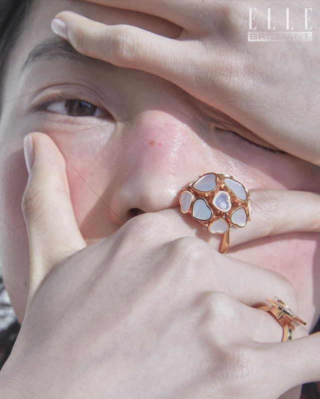 검지에 착용한 자개와 다이아몬드를 세팅한 ‘해피 하트’ 링은 1천3백만원대, 약지에 착용한 다이아몬드와 무빙 다이아몬드가 어우러진 ‘해피 스포츠’ 링은 9백만원대 모두 CHOPARD.