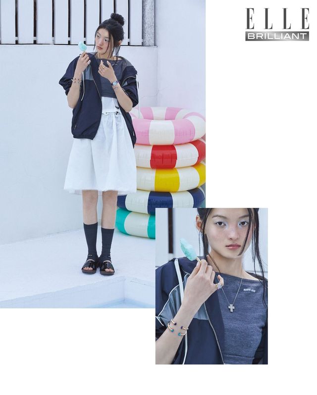 화이트 골드에 다이아몬드를 세팅한 ‘벨 에포크’ 네크리스는 가격 미정 DAMIANI. 오른손 소지에 착용한 꽃과 곤충을 형상화한 ‘디오레트’ 링은 가격 미정 DIOR joaillerie. 오른팔에 착용한 다이아몬드와 라피스 라줄리를 세팅한 ‘포제션’ 뱅글은 가격 미정, 다이아몬드와 튀르쿠아즈를 세팅한 ‘포제션’ 뱅글은 1천2백만원대 모두 PIAGET. 왼손 검지에 착용한 옐로 골드&화이트 골드 소재의 ‘마크리 카프리 이터넬레’ 링은 1천1백만원대 BUCCELLATI. 약지에 착용한 화이트 골드에 다이아몬드를 세팅한 ‘Tiffany T 트루 파베 와이드’ 링, 왼팔에 착용한 쿠션 셰이프의 다이얼이 특징인 ‘티파니 이터니티’ 워치는 모두 가격 미정 TIFFANY & CO. 터키석 스톤과 다이아몬드를 세팅한 ‘해피 하트’ 뱅글은 6백만원대 CHOPARD. 재킷과 울 스웨터, 화이트 포플린 스커트와 보디수트, 삭스, 슈즈는 모두 가격 미정 MIUMIU.