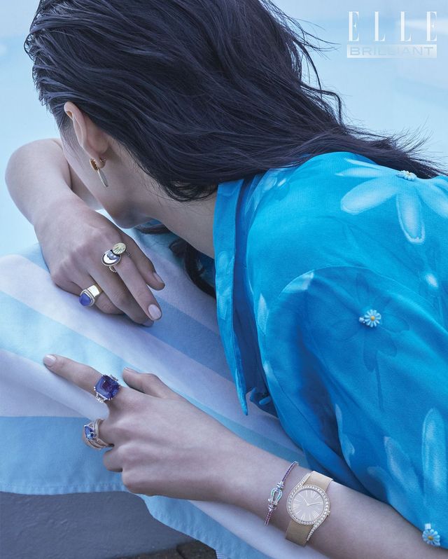옐로 골드 소재의 ‘로즈 셀레스트 싱글’ 이어링은 가격 미정, 오른손 검지에 착용한 다이아몬드와 머더오브펄, 오닉스를 장식한 ‘로즈 셀레스트’ 링은 가격 미정 모두 DIOR joaillerie. 약지에 착용한 옐로 골드에 라피스 라줄리를 세팅한 ‘빵 드 쉬크르 라피스 라줄리’ 링은 1천2백만원대, 왼팔에 착용한 화이트 골드에 다양한 컬러 스톤을 세팅한 ‘포스텐’ 브레이슬릿은 2천6백만원대 모두 FRED. 왼손 검지에 착용한 사파이어를 세팅한 ‘칵테일’ 링은 가격 미정 BUCCELLATI. 중지에 착용한 화이트 골드에 탄자나이트, 다이아몬드를 세팅한 ‘쏜 엠브레스 앤탱글 밴드’ 링은 가격 미정 STEPHEN WEBSTER. 브릴리언트 컷 다이아몬드를 세팅한 ‘라임라이트 갈라’ 워치는 7천6백만원대 PIAGET. 플라워 패턴 셔츠는 45만원 YOUNG N SANG. 비치 타월은 가격 미정 TEKLA.