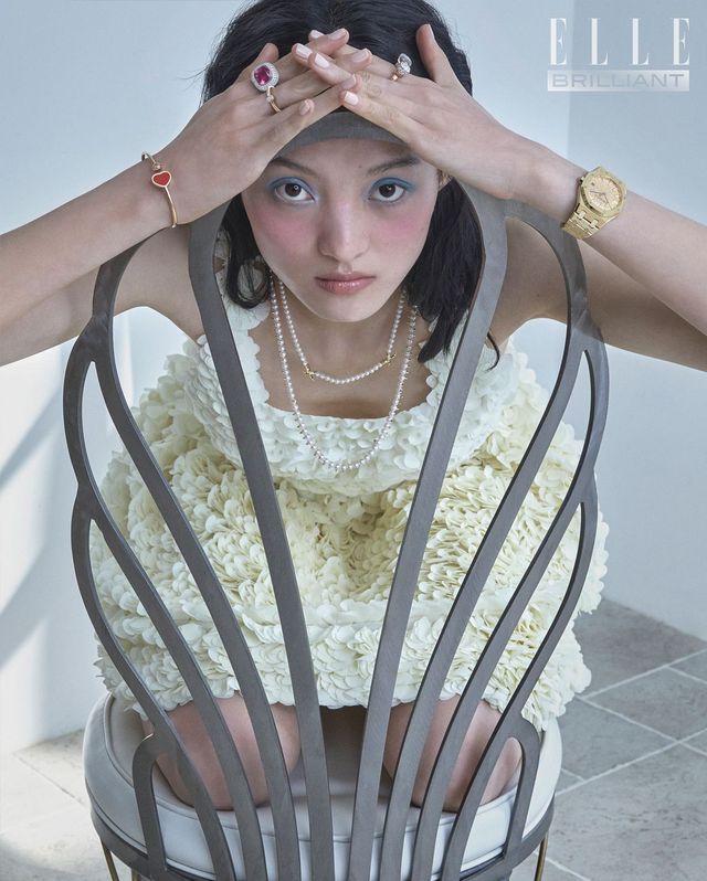 오른팔에 착용한 레드 인레이 스톤을 장식한 ‘해피 하트’ 뱅글은 6천1백만원 CHOPARD. 검지에 착용한 루벨라이트와 다이아몬드를 세팅한 ‘로즈 골드 누도 하이 주얼리 컬렉션’ 링, 중지에 착용한 화이트 다이아몬드를 세팅한 ‘로즈 골드 투게더’ 링, 왼손 검지에 착용한 화이트 토파즈와 화이트 다이아몬드를 세팅한 ‘누도 뚜아 에 무아’ 링은 모두 가격 미정 POMELLATO. 오른팔에 착용한 옐로 골드 케이스의 ‘로열 오크 프로스티드 골드 셀프와인딩’ 워치는 9천만원대 AUDEMARSPIGUET. 가시 모티프의 ‘데인저 호른’ 네크리스와 레이어드한 옐로 골드, 아코야 진주 소재의 ‘데인저’ 네크리스는 모두 가격 미정 TASAKI. 엠브로이더리 톱과 스커트는 모두 가격 미정 LORO PIANA.