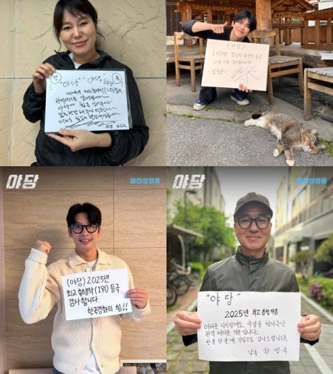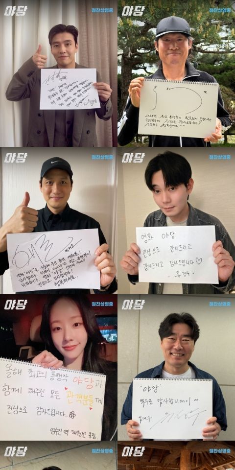 이처럼 올해 최고 흥행작에 등극한 '야당'의 감독과 배우들이 관객들에게 진심을 담은 친필 감사 메시지를 전했다. 강하늘, 유해진, 박해준, 류경수, 채원빈, 유성주, 김금순, 임성균, 조완기, 황병국 감독까지 한마음 한뜻으로 영화에 참여한 이들의 감사한 마음이 사진 속에 고스란히 담겨있다. “'야당' 2025년 최고 흥행작 등극! 감사합니다. 전부 한 분 한 분의 관객 여러분 덕분입니다. 정말 감사하고 우리 영화 선택해 주셔서 이렇게 모두가 웃을 수 있었습니다. 감사합니다!”(강하늘), “2025년 최고 흥행작이 될 수 있게 만들어 주신 많은 분들께 진심으로 감사드립니다! 건강하고 행복하세요!”(유해진), “영화 '야당'을 사랑해 주신 관객 여러분! 감사합니다. 덕분에 2025년 최고 흥행작이 되었습니다. 영화 '야당' 선택해 주셔서 진심으로 감사합니다! 행복하세요!”(박해준), “영화 '야당' 진심으로 감사드리고 감사드리고 감사드립니다!”(류경수), “올해 최고의 흥행작 '야당'과 함께 해주신 모든 관객분들께 진심으로 감사드립니다!”(채원빈), “'야당' 억수로 감사합니데이~”(유성주), “'야당' 2025년 최고 흥행작 1위 등극! 관객 여러분 감사드립니다. 야당에 힘을 실 어주시고 많이 관람해 주신 덕분입니다. 저희도 힘입어 열심 내겠습니다!”(김금순), “2025년 최고의 흥행작 등극 너무너무 감사합니다!”(임성균), “'야당' 2025년 최고 흥행작 1위 등극! 감사합니다. 한국 영화의 힘!!”(조완기), “'야당' 2025년 최고 흥행 작품! 어려운 시기임에도 극장을 찾아주신 관객 여러분 덕분입니다. 한 분 한 분께 진심으로 감사드립니다!”(황병국 감독) 등 하얀 종이를 가득 채운 배우들과 감독의 영화를 향한 진심이 느껴진다. 이러한 배우들과 감독의 진심 어린 마음만큼 관객들 역시 열렬히 극찬하며 흥행하고 있는 '야당'은 앞으로도 짜릿한 흥행 순항을 이어갈 전망이다.