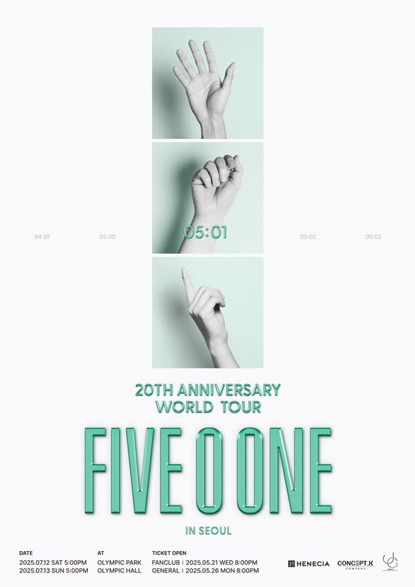 헤네치아는 13일 “파이브 오 원이 오는 7월 12~13일 양일간 서울 올림픽공원 올림픽홀에서 ‘2025 파이브 오 원 : 20주년 기념 월드투어 인 서울’(2025 FIVE O ONE : 20th Anniversary World Tour In Seoul)을 개최한다”고 밝혔다. 월드투어의 첫 시작이 될 이번 공연에서 오랜 시간을 기다린 팬들에게 보내는 세 사람의 아름다운 하모니가 감동을 선사할 예정이라고 덧붙였다.