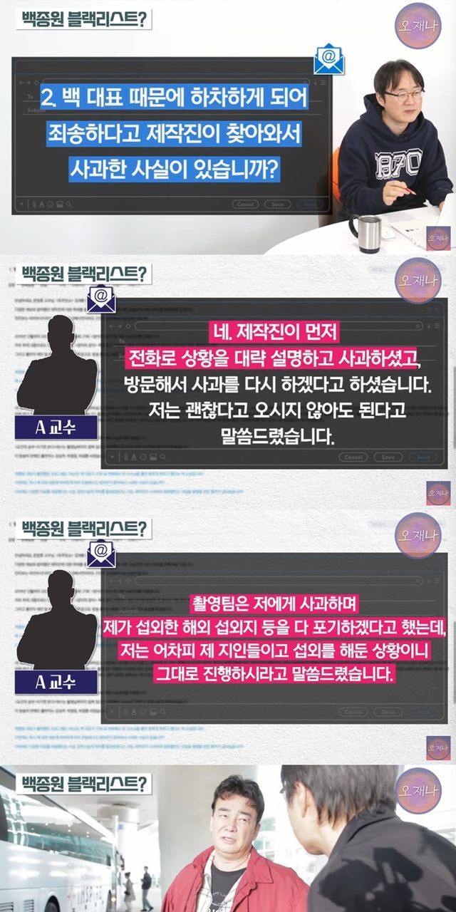 이어 백 대표 때문에 하차하게 돼 제작진이 사과한 사실이 있나라는 질문에는 "그렇다. 제작진이 먼저 전화로 상황 설명하고 사과했고 방문해서 사과를 다시하겠다고 했다. 전 오시지 않아도 된다고 했지만 제작진이 직접 오셔서 사과했다"는 답변을 보냈다.