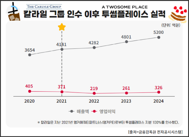 투썸의 화려한 마케팅 뒤에 가려진 제품 품질 저하 논란의 배경에 사모펀드 중심의 경영 전략이 자리잡고 있다는 비판이 나온다. 투썸플레이스는 2021년 글로벌 사모펀드 칼라일그룹에 인수된 이후 매출과 이익 모두 성장세를 기록했다. 2023년 기준 매출 5200억원, 영업이익 326억원으로 2년 연속 최대 실적을 경신했지만, 그 이면에는 소비자 불만이 쌓이고 있다는 것이다.