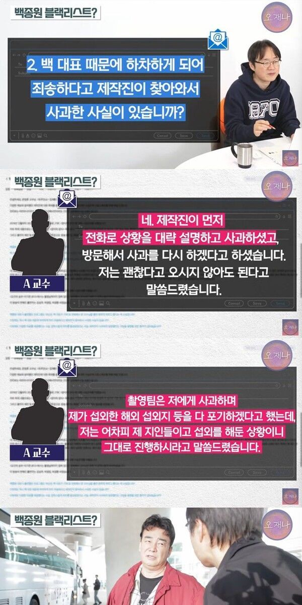 김재환 감독은 해당 교수가 '백종원 때문에 하차 통보를 받은 것이 사실이냐'는 질문에 '네'라고 답했으며, '백 대표 때문에 하차하게 돼 제작진이 사과한 사실이 있냐'는 질문에도 '그렇다. 제작진이 먼저 전화로 상황 설명하고 사과했고 방문해서 사과를 다시 하겠다고 해서 직접 오셔서 사과했다'는 답변을 받았다고 공개했다. 해당 교수는 제작진과 주고받은 문자 메시지와 당시 미팅 기록이 담긴 다이어리가 증거로 있다고 김 감독은 덧붙였다. 김 감독은 백종원이 자신이 직접 출연하지 않는 프로그램에서도 해당 교수의 출연자 하차에 개입했다는 주장과 증거도 제시했다.