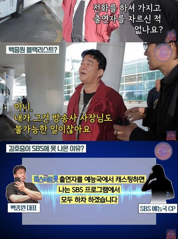 이 외에도 김재환 감독은 백종원이 '골목식당' 방영 당시 경쟁 중이던 TV조선 트로트 프로그램('미스터트롯') 출연자 김호중의 SBS 출연을 막았다고 주장했다. 김 감독은 백종원에게 직접 들었다며, 백종원이 'SBS를 위해 고생하는데 미스터트롯과 시청률 전쟁을 치르는 중인 김호중을 SBS에 출연시키는 건 말이 안 된다'고 생각했고, CP에게 전화해 해당 트로트 프로그램 출연자를 예능국에서 캐스팅하면 모든 SBS 프로그램에서 하차하겠다고 말했다는 내용을 전했다. 김 감독은 이때부터 갑질 이야기가 생겨났다고 주장했다.