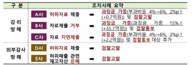 회계감리 방해 역시 금감원의 자료 제출·출석 요구에 불응하거나 허위자료 제출, 진술 거부 등으로, 벌칙 뿐만 아니라 과징금이 가중된다.