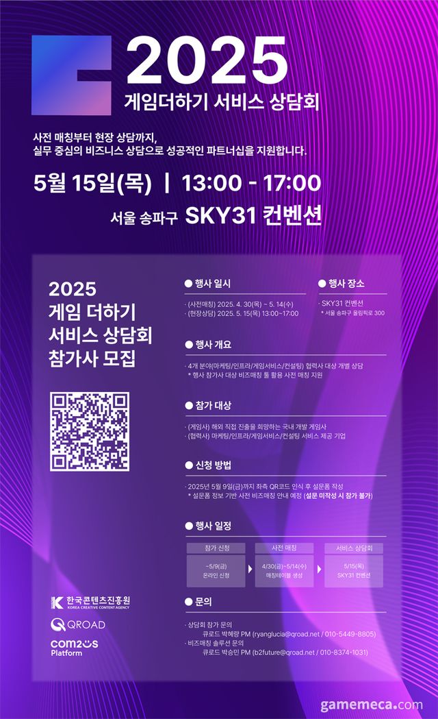오후 1시부터는 해외 진출 전문 서비스를 제공하는 62개 협력사가 참여해 ▲컨설팅 ▲마케팅 ▲인프라 ▲게임서비스 등 분야별로 1 대 1 상담 부스를 운영한다. 5월 9일부터 14일까지 QR 코드 또는 현장 등록을 통해 신청할 수 있으며, 게임더하기 사업에 선정되지 않은 게임사도 신청 및 참가가 가능하다.