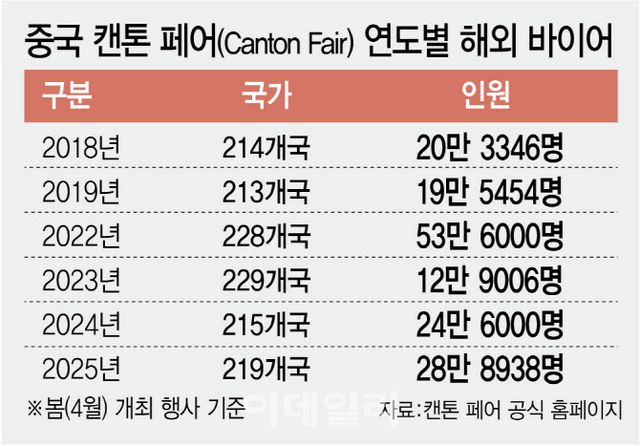 [이데일리 이선우 기자] 지난 5일 중국 광둥성 광저우에서 끝난 종합 무역 박람회 ‘캔톤 페어’(Canton Fair). 도널드 트럼프 미국 행정부가 주요 교역국에 고율 관세를 부과한 직후인 지난달 15일부터 보름간 열린 이 행사에는 219개국에서 28만 8938명의 해외 바이어가 참여했다. 1년 전보다 17% 넘게 늘어난 수치다. 브라질과 인도, UAE 등 브릭스(BRICS) 지역에서 24%, 한국과 일본, 호주, 동남아 등 역내포괄적경제동반자협정(RECP) 회원국에서 7% 넘게 바이어 참여가 늘었다. 매년 10% 중반 내외를 유지하던 유럽 바이어도 3% 넘게 늘어 비중이 18%까지 높아졌다.