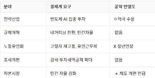 이 가운데 반도체·AI·기후기술 등 전략산업에 대한 국가 주도형 투자 확대는 경제계의 요구와 결을 같이한다. 그러나 다른 분야에서는 거리감이 크다.