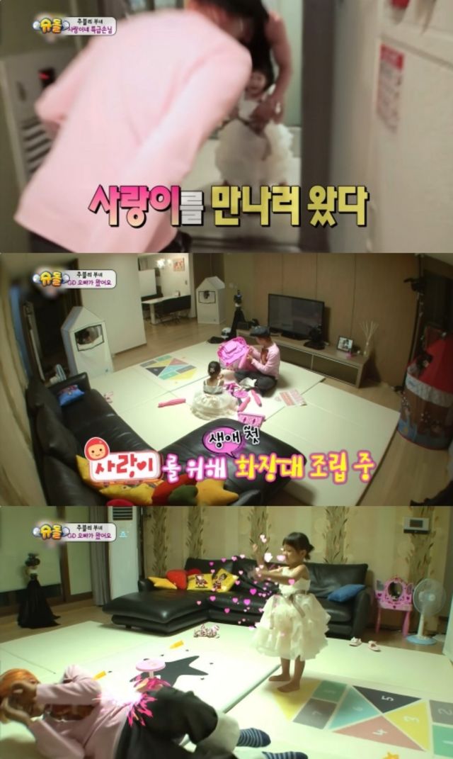 사랑은 지디가 선물한 장난감을 하나씩 조립하면서 힐끗힐끗 지드래곤을 쳐다보면서 수줍은 모습을 보이다가도 갑자기 노래에 맞춰 춤을 추는 등 지디를 당황시켰다.