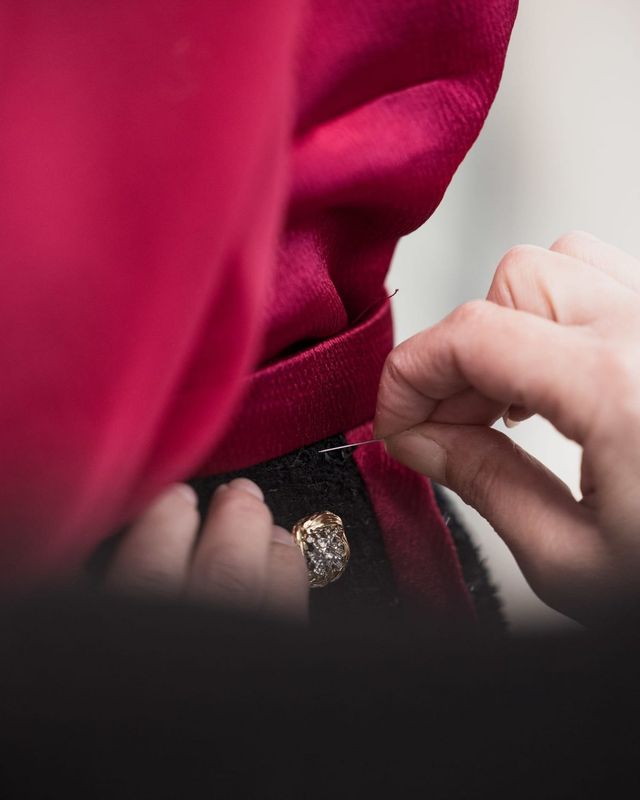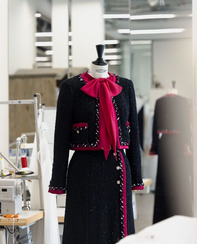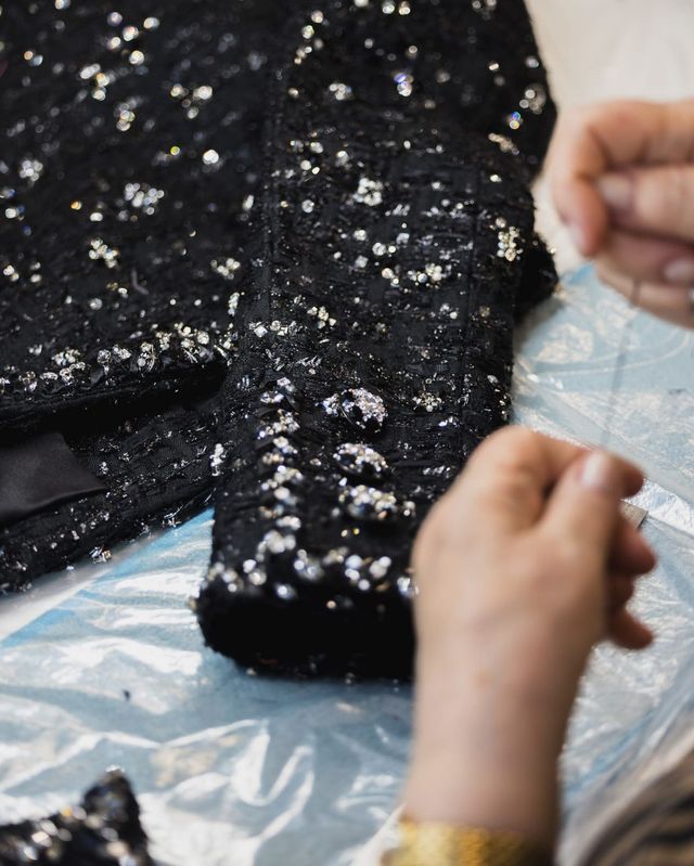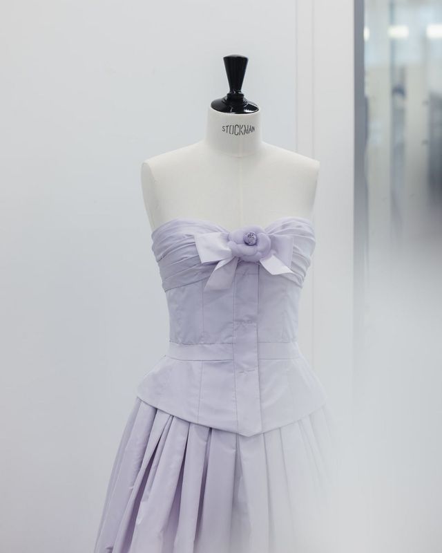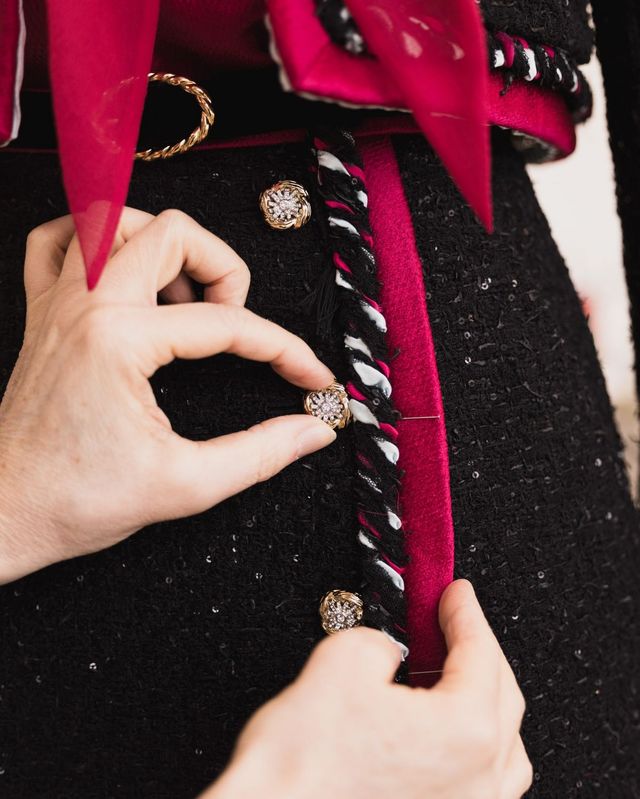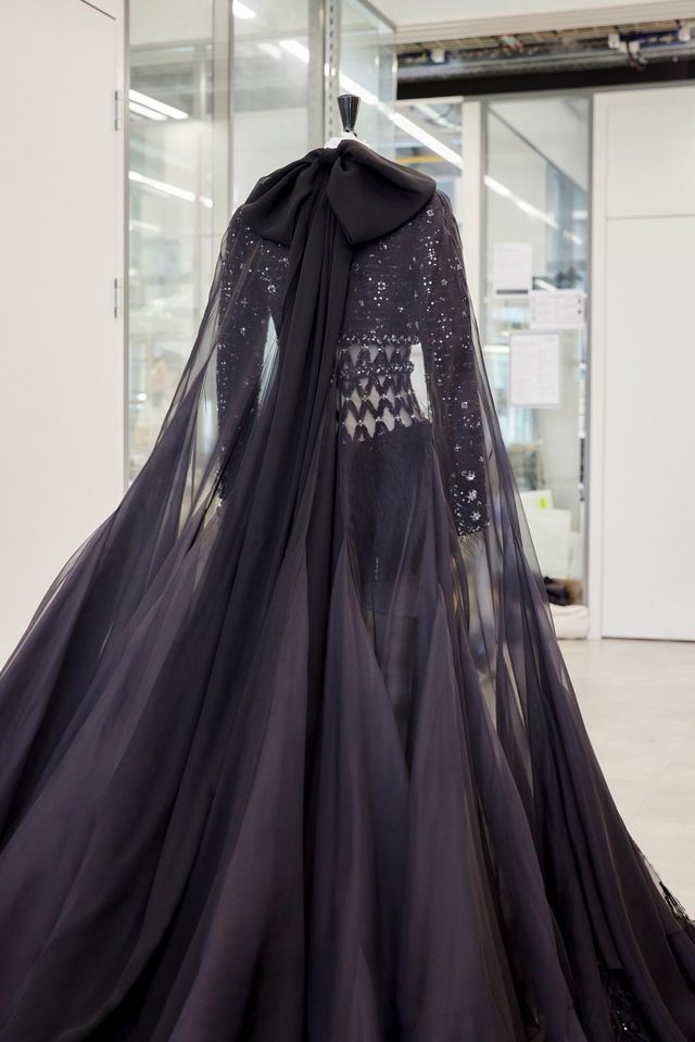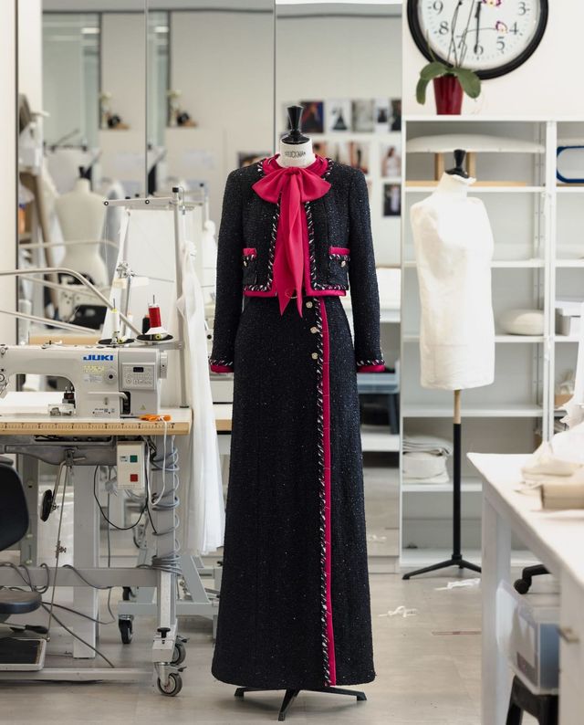 반면 휘트니 픽은 가장 최신 컬렉션을 선택했습니다. 2025 봄-여름 오뜨 쿠튀르 컬렉션의 블랙 시퀸 트위드 스커트 슈트에 라즈베리 컬러의 커스텀 롱 드레스로 레이어링을 완성했죠.