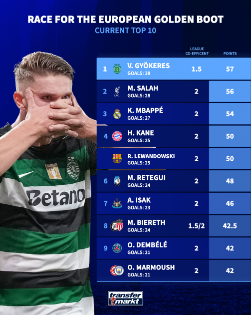 현재 이 부문 1위는 요케레스다. 요케레스는 포르투갈 리그에서 활약하는 터라 자신의 득점에 1.5를 곱한 값이 최종 포인트가 된다. 하지만 그는 리그에서만 38골을 넣어 57점을 기록 중이다. 만약 요케레스가 이 흐름을 이어갈 경우, 2002년 마리오 자르델 이후 23년 만에 유럽 5대 리그 외 소속 선수가 골든부츠를 수상하게 된다.