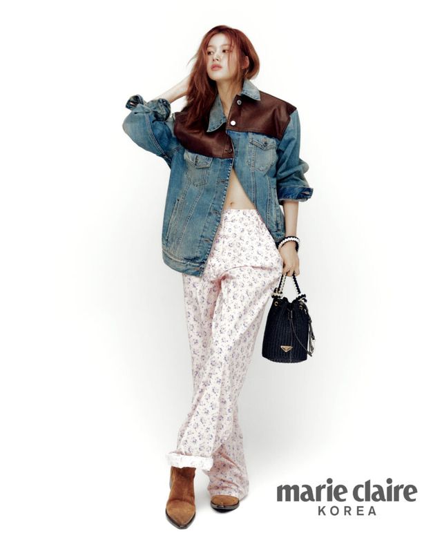 가죽 패치 오버사이즈 데님 재킷, 플라워 프린트 팬츠, 크로쉐 미니 버킷 백, 웨스턴 부츠 모두