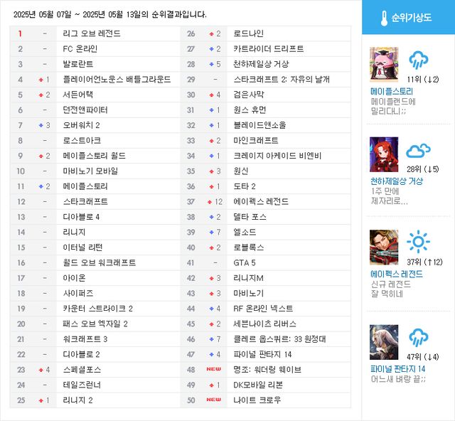 이번 주 인기순위에서 가장 큰 상승을 이뤄낸 게임은 에이펙스 레전드다. 무려 12계단을 뛰어 37위에 자리했다. 에이펙스 레전드는 작년 상반기만해도 20위대 후반에서 30위대 사이를 오르내리는 흐름을 보였으나, 하반기부터 급격한 하락세를 타며 40위대를 벗어나지 못했다. 올해 들어서도 하위권에서 진입과 이탈을 반복하는 지지부진한 행보를 이어가다가 5월에 접어들며 큰 폭으로 반등했다.