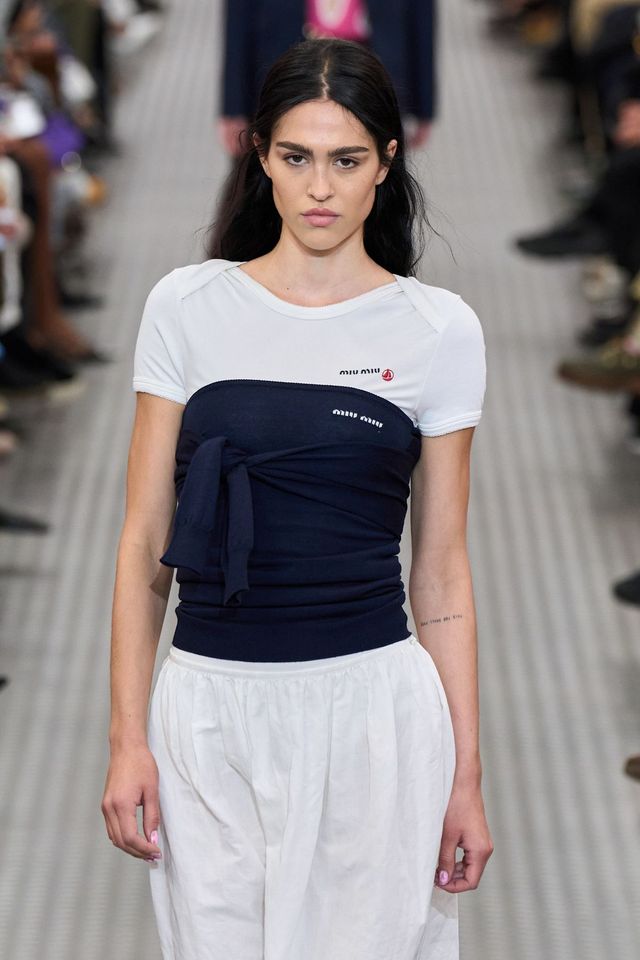네이비 니트를 꼭 정석적으로 입을 필요 있어? 주말 동안 데이트와 모임 혹은 집에서 열린 나만의 파티로 빵빵해진 배를 숨길 수 없다면 미우 미우 컬렉션 속 네이비 니트 스타일링에 주목. 드레스 또는 스윔 웨어에네이비니트로 허리를 감싸 개성 있는 뷔스티에를 만들어보자.