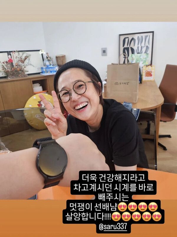 뉴시스 보도에 따르면, 개그우먼 홍윤화는 지난 13일 인스타그램 스토리에 "더욱 건강해지라고 차고 계시던 시계를 바로 빼주시는 멋쟁이 선배님. 사랑합니다"라며 사진을 올렸다.