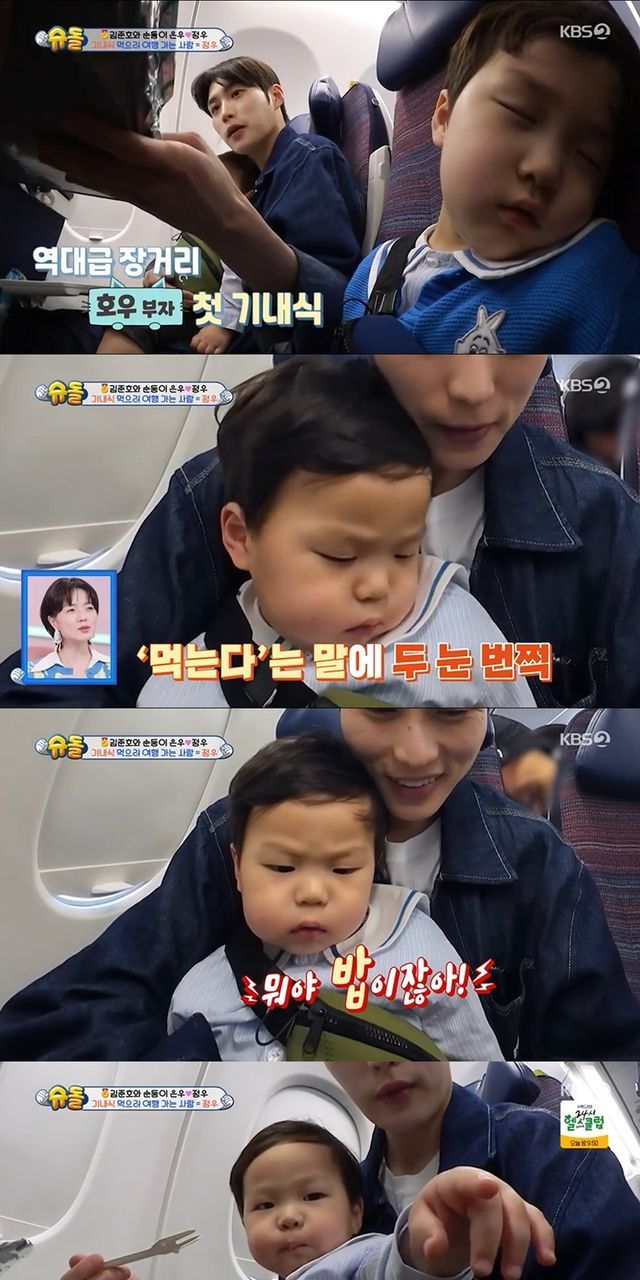이어 은우와 정우를 위한 유아용 기내식도 따로 제공됐고, 정우는 "달걀이 있다. 밥이다. 고기다. 호박이다"라고 또 다른 기내식에 눈을 빛냈다.