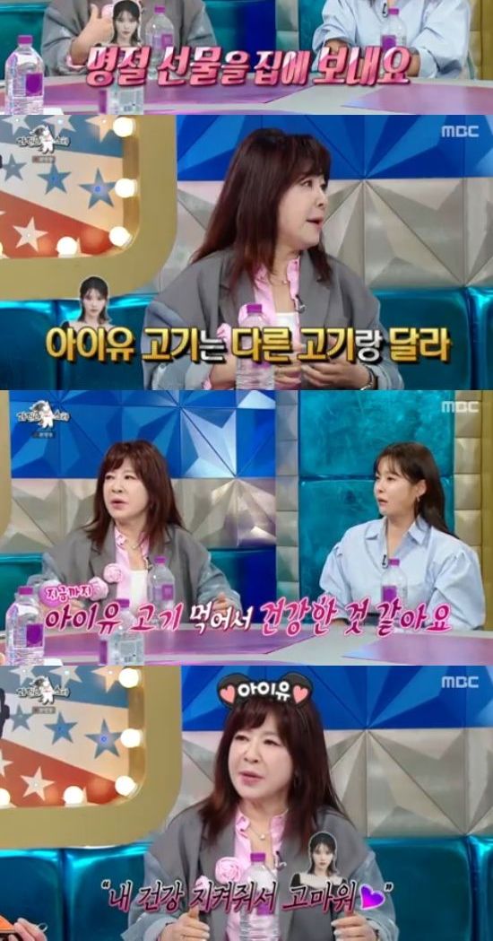 그러면서 "로열젤리, 석청 이런 것도 보내주고, 요즘에는 고기로 바뀌었다. 그런데 고기가 다르다. 너무 특별해서 아들도 안 주고 나만 먹는다. 그 고기를 먹어서 내가 건강한 것 같다. 이 자리를 통해서 아이유에게 고맙다고 말하고 싶다"면서 고마워했다.
