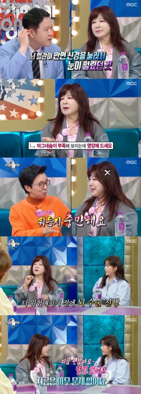 이날 방송에서 노사연은 3년 전' 라디오스타' 출연 후 눈 떨림 증상으로 많은 걱정을 샀다면서 "그 때 뇌 혈관이 안면 신경을 눌러서 눈이 떨렸던 것이었다. 댓글에 '영양제를 챙겨 먹으라'고 하셨는데, 영양은 모든 게 충만하다"면서 웃었다.