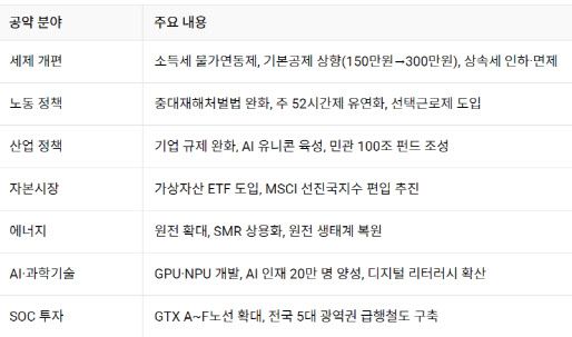 AI·과학기술 정책도 기존 성장주의 정책을 따르고 있다. 민간 중심의 기술 생태계 구축을 큰 틀로 놓고 △100조원 규모의 민관 AI 투자 펀드 조성, △GPU·NPU 등 차세대 AI 반도체 개발, △공공데이터 개방 확대 및 디지털 리터러시 확산, △AI 인재 20만 명 양성, △국가 AI 위원회 기능 강화 등 교과서적인 방안을 제시했다.