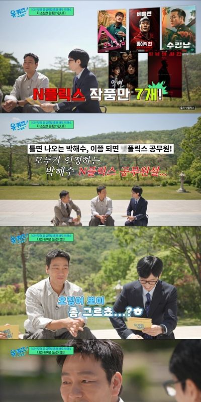 이날 유재석이 "박해수 씨 하면 '오징어 게임', '종이의 집', '수리남', '악연', '사냥의 시간' 등 넷플릭스 작품만 7개다. 소위 말해 '넷플릭스 공무원' 이런 얘기가 있었다"고 하자 박해수는 "앞으로 나올 게 몇 개 더 있긴 하다"고 답해 감탄을 자아냈다.
