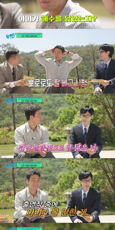 이어 유재석이 "아빠가 수감 중인데 그것도 보여주기 좀 그렇다"고 덧붙이자 박해수는 "보여줄 수 있는 작품이 있어졌으면 좋겠다"며 아들을 향한 애정을 드러냈다.