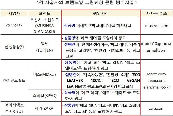 [컨슈머뉴스=이태림 기자] 공정거래위원회는 ㈜무신사, 신성통상㈜, ㈜이랜드월드, 아이티엑스코리아(유) 등 4개 SPA(Specially retailer, Private label, Apparel) 의류 브랜드 사업자가 자사 가죽제품 등을 친환경 상품으로 표시 ‧ 광고한 행위에 대해 「표시‧광고의 공정화에 관한 법률」(이하 ‘표시광고법’이라 한다) 위반으로 경고 조치했다.