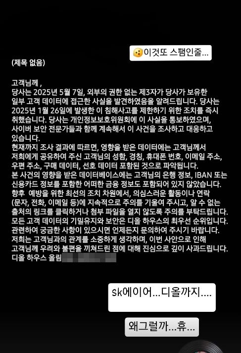 문자 내용에는 '당사는 2025년 5워 7일 외부의 권한 없는 제 3자가 당사가 보유한 일부 고객 데이터에 접근한 사실을 발견했음을 알려드린다'라고 적혀 있다.