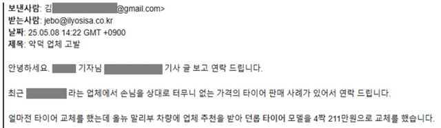 이 경우 신중하게 살피지 않은 소비자의 잘못도 존재하지만, 업체가 전문 지식이 없는 소비자를 속여서도 안 된다. 지난 8일 <일요시사>엔 ‘터무니없는 가격에 타이어를 판 악덕 업체를 고발한다’는 제보가 들어왔다.