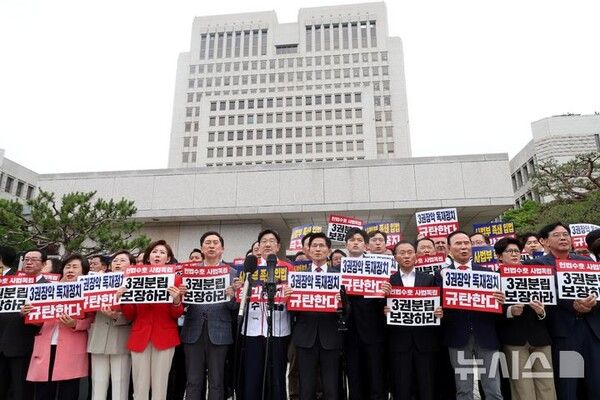 뉴시스 보도에 따르면, 권성동 원내대표는 이날 오후 서울 서초구 대법원 앞에서 사법부 수호 및 민주당 규탄대회를 열고 "범죄자가 본인을 무죄로 만들기 위해 사법부를 살해하고 헌법을 살해하고 있다. 헌법살인, 민주주의 살인"이라며 이같이 밝혔다.