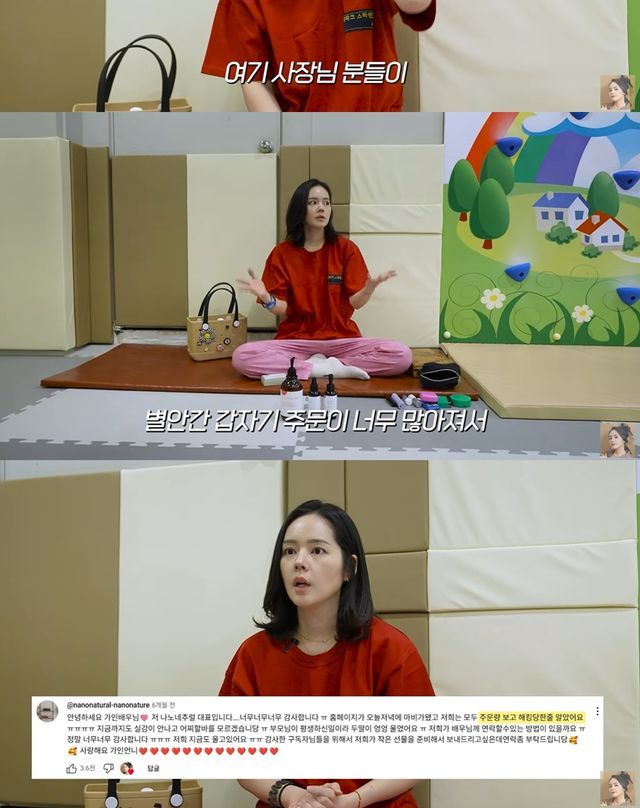 앞서 한가인은 다른 영상에서 욕실템을 소개하기도 했다. 그는 샴푸, 바디워시, 바디오일, 바디미스트를 꺼낸 뒤 "품절 대란이 났던 회사의 제품"이라며 "난리가 났었다. 여기 사장님 분들이 별안간 갑자기 주문이 너무 많아져서 해킹을 당한 줄 알았다고 댓글을 달았다"고 말해 그의 영향력을 실감케 했다.