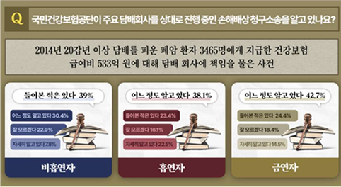 한국의학바이오기자협회가 전국 20세 이상 성인 1209명(비흡연자 757명, 흡연자 218명, 금연자 234명)을 대상으로 실시한 온라인 설문조사결과에 따르면 일단 응답자 중 45.9%는 건보공단의 담배 소송을 어느 정도(34.2%) 또는 자세히(11.7%) 알고 있다고 답했다. 단순히 들어본 적 있다는 응답은 33.3%였다. 자세히 알고 있다는 응답의 경우 흡연자 그룹이 22.5%로 비흡연자(7.8%), 금연자(14.5%)보다 높았다. 들어본 적 있다는 답변은 비흡연자(39%), 금연자(24.4%), 흡연자(23.4%) 순이었다.